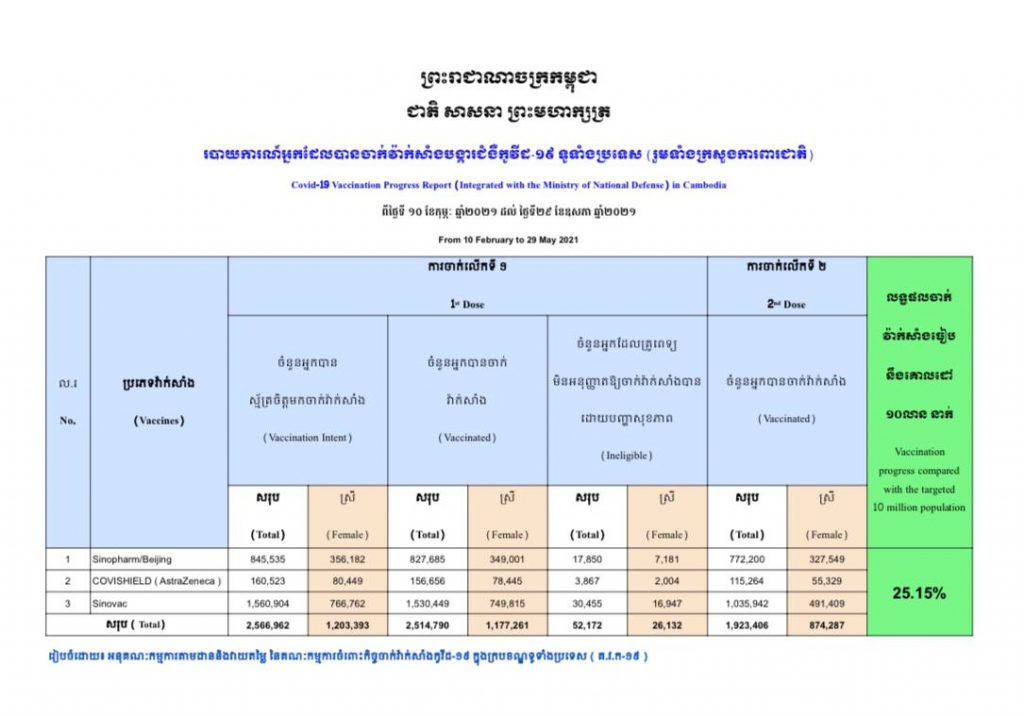 ក្រសួងសុខាភិបាល បានប្រកាសថា គិតត្រឹមថ្ងៃទី ២៩ ឧសភា ២០២១នេះ ប្រជាពលរដ្ឋកម្ពុជា បានចាក់វាក់សាំងប្រឆាំងកូវីដ១៩ ចំនួន ២៥,១៥% ហើយ បើធៀបចំនួនប្រជាពលរដ្ឋ១០លាននាក់។