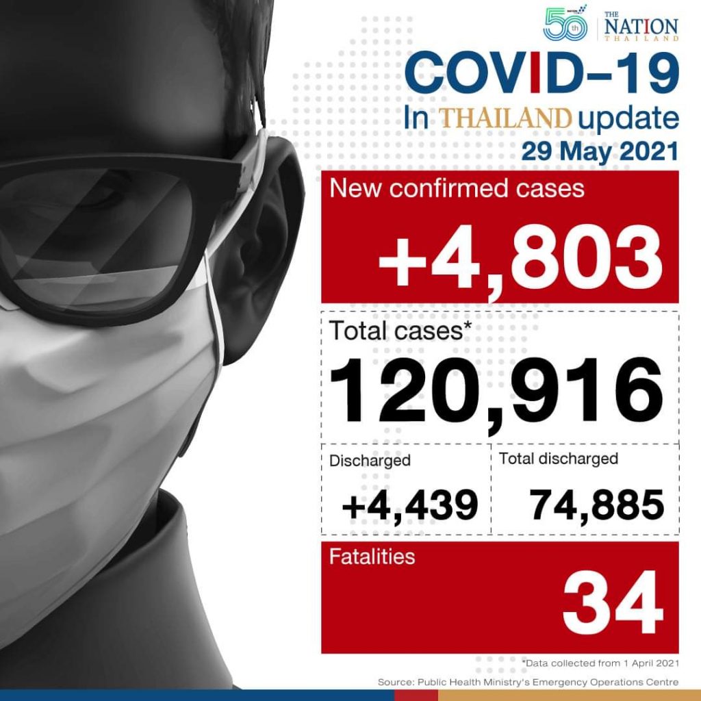 The Nation បានចេញផ្សាយ នៅថ្ងៃអាទិត្យទី៣០ ឧសភា ២០២១នេះថា ប្រទេសថៃមានឆ្លងជំងឺកូវីដ១៩ថ្មី ៤៥២៨នាក់ទៀត ក្នុងពេល២៤ម៉ោងចុងក្រោយនេះ ខណៈម្សិលមិញ ប្រកាសថា ឆ្លងថ្មីជិត៥ពាន់នាក់ ដូច្នេះ ២ថ្ងៃជាប់គ្នា ថៃមានឆ្លងថ្មីជាង៩ពាន់ករណី។