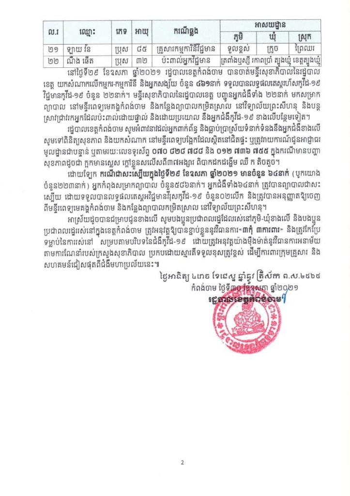 សេចក្តីប្រកាសព័ត៌មានរបស់រដ្ឋបាលខេត្តកំពង់ចាម ស្តីពីករណីរកឃើញវិជ្ជមានកូវីដ-១៩ ចំនួន ២២នាក់ ក្នុងនោះ ស្រុកជើងព្រៃ ០៦នាក់ ស្រុកបាធាយ ០៧នាក់ ស្រុកកំពង់សៀម ០២នាក់ ស្រុកស្រីសន្ធរ ០៣នាក់ ព្រៃឈរ ០៣នាក់ ខេត្តត្បូងឃ្មុំ ចំនួន ០១នាក់ និងករណីជាសះស្បើយចំនួន ៦៤នាក់ក្នុងថ្ងៃទី២៩ ខែឧសភា ឆ្នាំ២០២១។