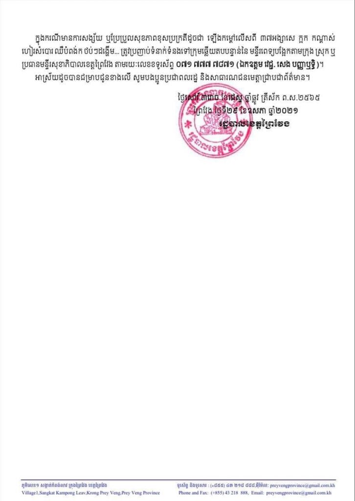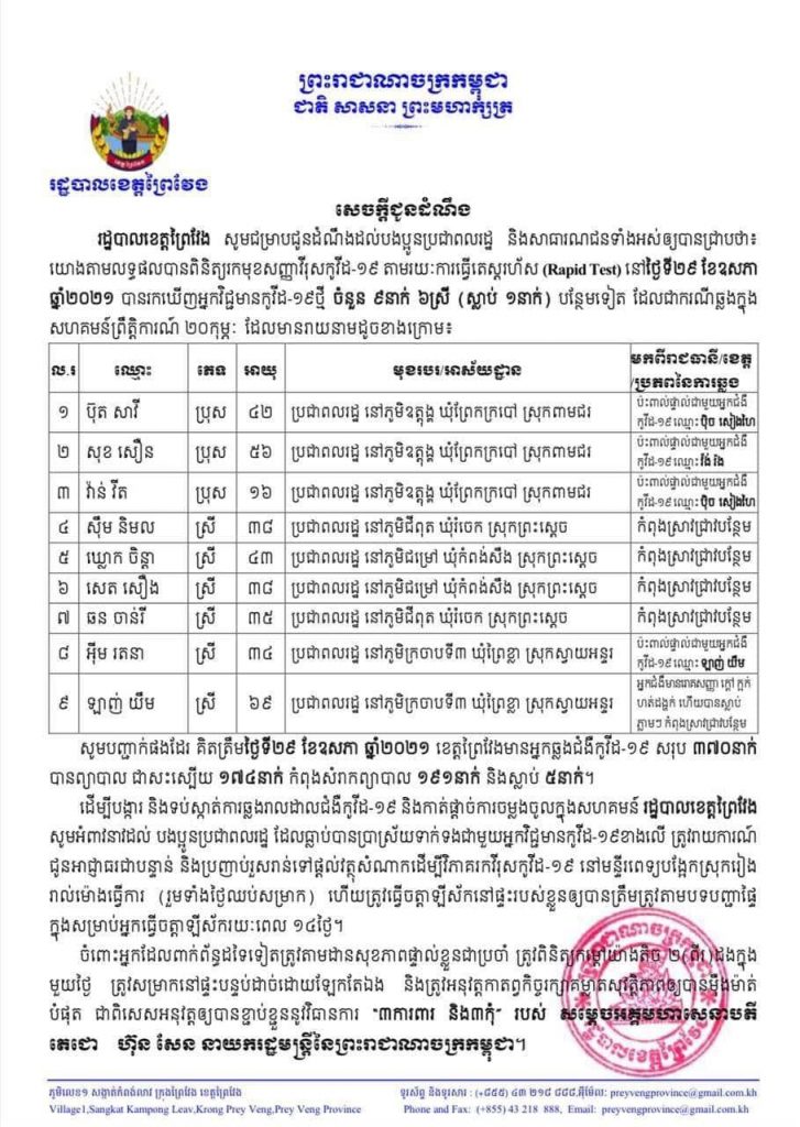 អត្តសញ្ញាណអ្នកវិជ្ជមានកូវីដ១៩ចំនួន ៩នាក់ និងស្លាប់ម្នាក់ នៅខែត្តព្រៃវែង រកឃើញថ្ងៃទី២៩ ឧសភា ២០២១One-Minuteអត្ថបទដោយ៖AMS OneMinute អ្នកឆ្លងសរុប ៣៧០នាក់ជាសះស្បើយសរុប ១៧៤នាក់ស្លាប់ ៥នាក់ AMS OneMinuteអត្ថបទមុនអត្ថបទបន្ទាប់
