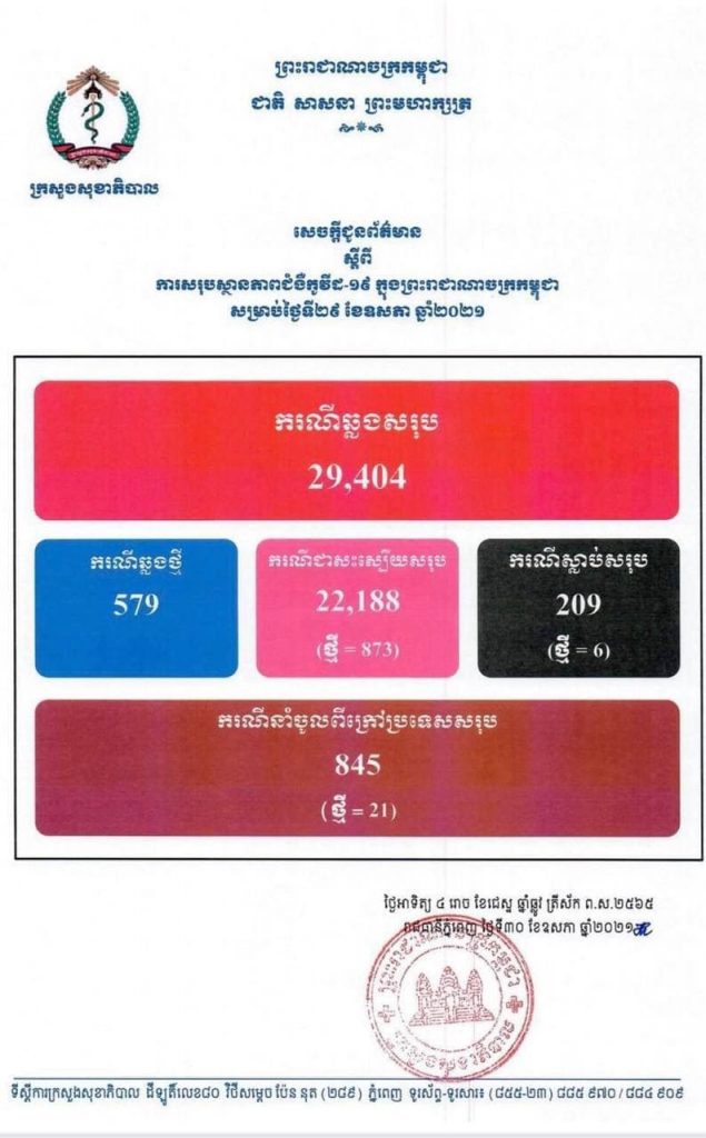 កូវីដ១៩នៅកម្ពុជា 🦠🇰🇭One-Minuteអត្ថបទដោយ៖AMS OneMinute រកឃើញករណីឆ្លងថ្មី ៥៧៩នាក់ជាសះស្បើយ ៨៧៣នាក់ស្លាប់ ៦នាក់ គិតត្រឹមថ្ងៃទី៣០ ឧសភា ២០២១ ចំនួនអ្នកឆ្លងសរុប៖ ២៩៤០៤នាក់ចំនួនអ្នកជាសះស្បើយ៖ ២២១៨៨នាក់ចំនួនអ្នកស្លាប់សរុប៖ ២០៩នាក់ AMS OneMinuteអត្ថបទមុនអត្ថបទបន្ទាប់