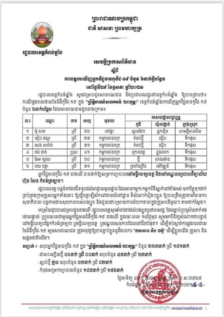 អត្តសញ្ញាណអ្នកវិជ្ជមានកូវីដ១៩ចំនួន ៦នាក់ នៅខេត្តកំពង់ឆ្នាំង រកឃើញថ្ងៃទី២៩ ឧសភា ២០២១One-Minuteអត្ថបទដោយ៖AMS OneMinute អ្នកឆ្លងសរុប ១៨១នាក់ជាសះស្បើយសរុប ៤៥នាក់ស្លាប់ ៣នាក់ AMS OneMinuteអត្ថបទមុនអត្ថបទបន្ទាប់
