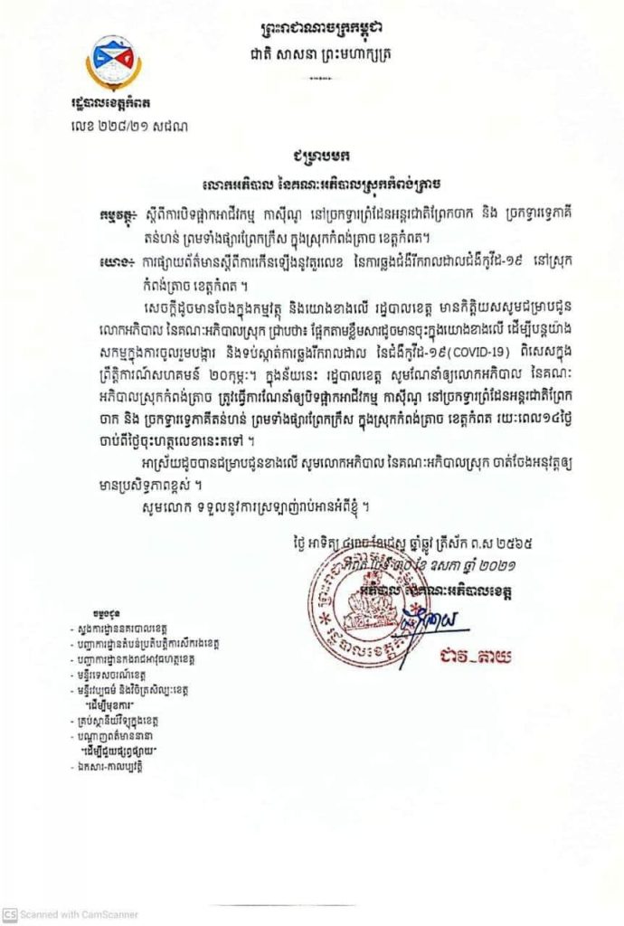 រដ្ឋបាលខេត្តកមពត នៅថ្ងៃទី៣០ ខែឧសភាឆ្នាំ២០២១១ បានចេញសេចក្តីជូនដំណឹងពីការផ្អាក កន្លែងអាជីវកម្ម២កន្លែង និងទីផ្សារព្រែកក្រឹស ក្នុងស្រុកកំពង់ត្រាច ខេត្តកំពត។ យោងតាមសេចក្តីជូនដំណឹង រដ្ឋបាលខេត្តកំពត បានណែនាំអាជ្ញាធរស្រុកកំពង់ត្រាច ធ្វើការបីផ្អាកអាជីវកម្មកាស៊ីណូនៅច្រកទ្វារព្រំដែនអន្តរជាតិព្រែកចាក និងច្រកទ្វារទ្វេភាគីតន់ហន់ ព្រមទាំងផ្សារព្រែកក្រឹស ក្នុងស្រុកកំពង់ត្រាច ខេត្តកំពត រយៈពេល១៤ថ្ងៃចាប់ពីថ្ងៃទី៣០ ខែឧសភា ឆ្នាំ២០២១នេះតទៅ។