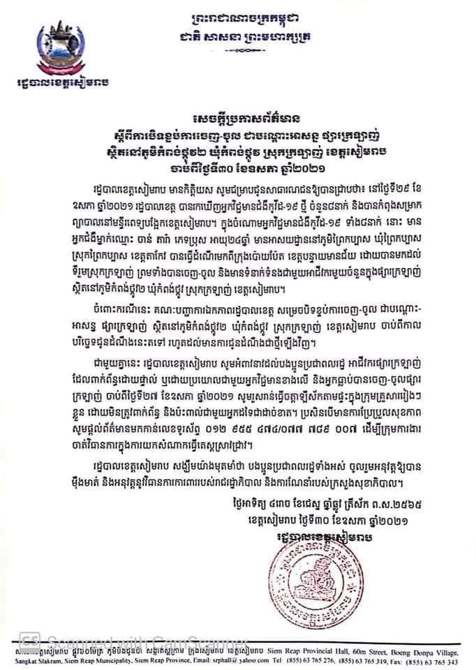 រដ្ឋបាលខេត្តសៀមរាប សម្រេចបិទខ្ទប់ការចេញ-ចូលផ្សារក្រឡាញ់