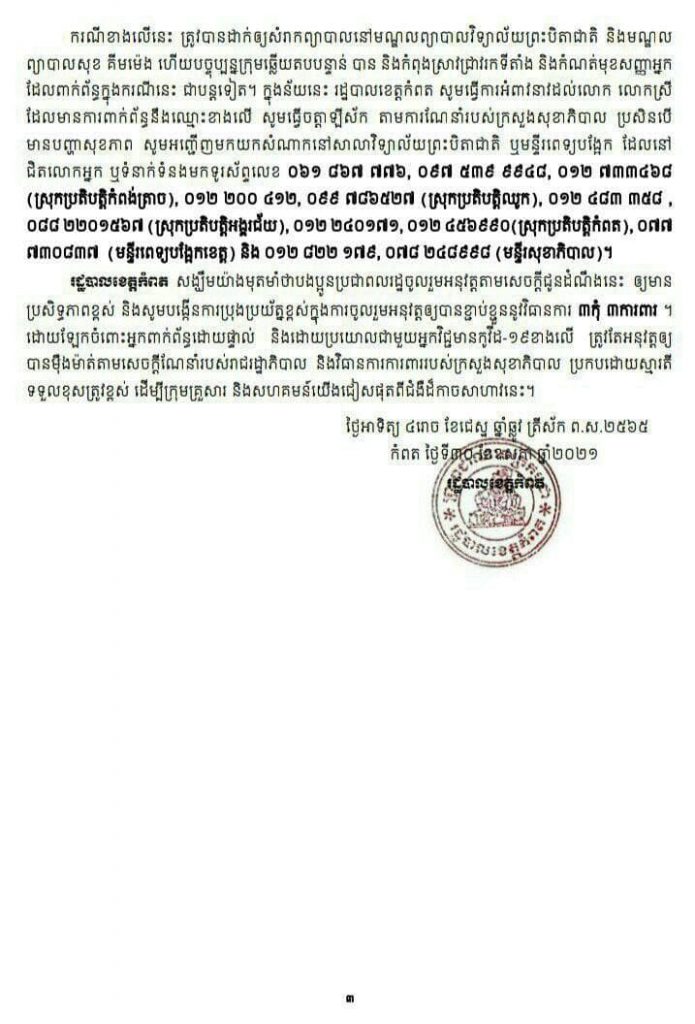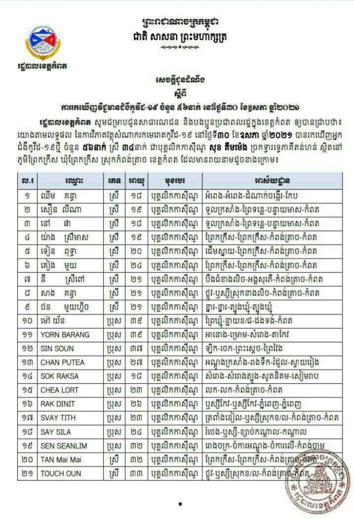 អត្តសញ្ញាណអ្នកវិជ្ជមានកូវីដ១៩ចំនួន ៥៦នាក់ ជាបុគ្គលិកកាស៊ីណូ សុខ គឹមម៉េង ស្ថិតនៅភូមិព្រែកក្រឹស ឃុំព្រែកក្រឹស ស្រុកកំពង់ត្រាច ខេត្តកំពតOne-Minuteអត្ថបទដោយ៖AMS OneMinute ៣០ ឧសភា ២០២១ AMS OneMinuteអត្ថបទមុនអត្ថបទបន្ទាប់