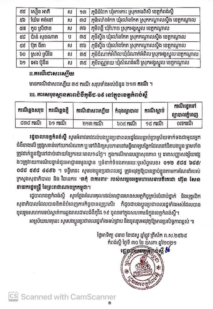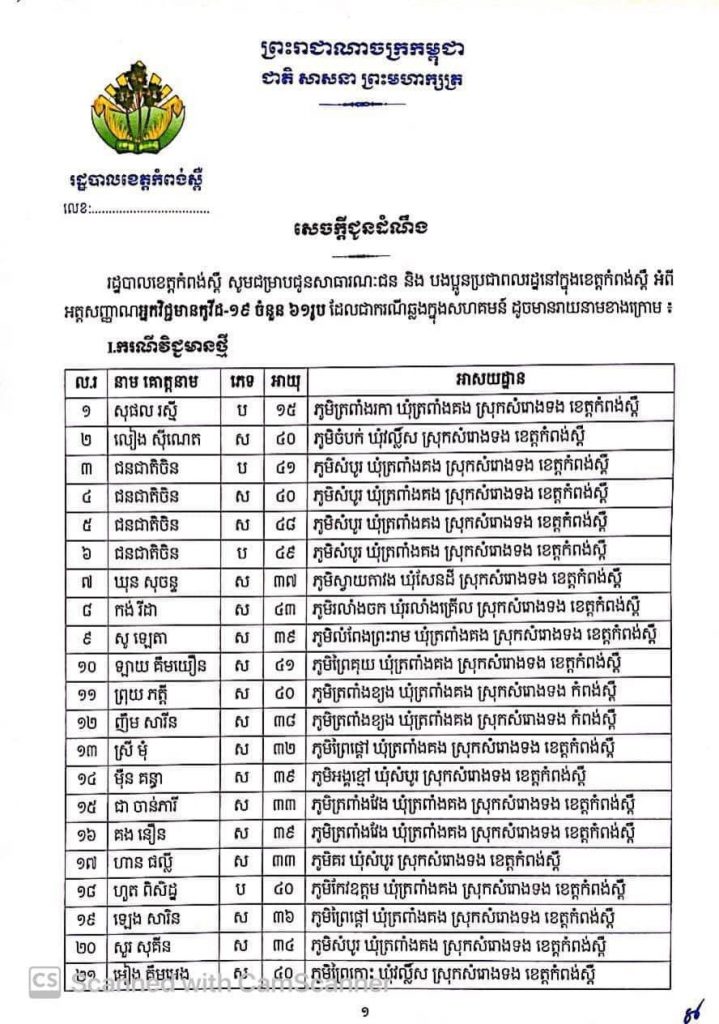 អត្តសញ្ញាណអ្នកវិជ្ជមានកូវីដ១៩ចំនួន ៦១នាក់ និងជាសះស្បើយចំនួន ៣៥នាក់ នៅខេត្តកំពង់ស្ពឺOne-Minuteអត្ថបទដោយ៖AMS OneMinute អ្នកឆ្លងសរុបចំនួន ៨៣៨នាក់ជាសះស្បើយសរុបចំនួន ២១៣នាក់ស្លាប់ ១៥នាក់ ៣០ ឧសភា ២០២១ AMS OneMinuteអត្ថបទមុនអត្ថបទបន្ទាប់