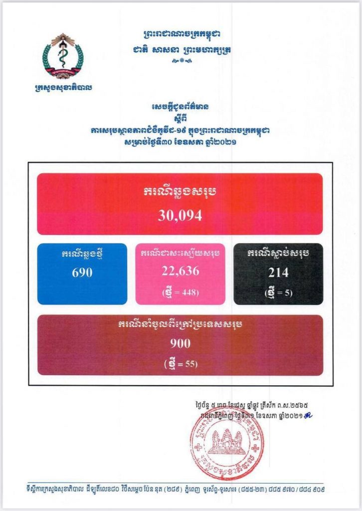 កូវីដ១៩នៅកម្ពុជា 🦠🇰🇭One-Minuteអត្ថបទដោយ៖AMS OneMinute រកឃើញករណីឆ្លងថ្មី ៦៩០នាក់ជាសះស្បើយ ៤៤៨នាក់ស្លាប់ ៥នាក់ គិតត្រឹមថ្ងៃទី៣១ ឧសភា ២០២១ ចំនួនអ្នកឆ្លងសរុប៖ ៣០០៩៤នាក់ចំនួនអ្នកជាសះស្បើយ៖ ២២៦៣៦នាក់ចំនួនអ្នកស្លាប់សរុប៖ ២១៤នាក់ AMS OneMinuteអត្ថបទមុនអត្ថបទបន្ទាប់