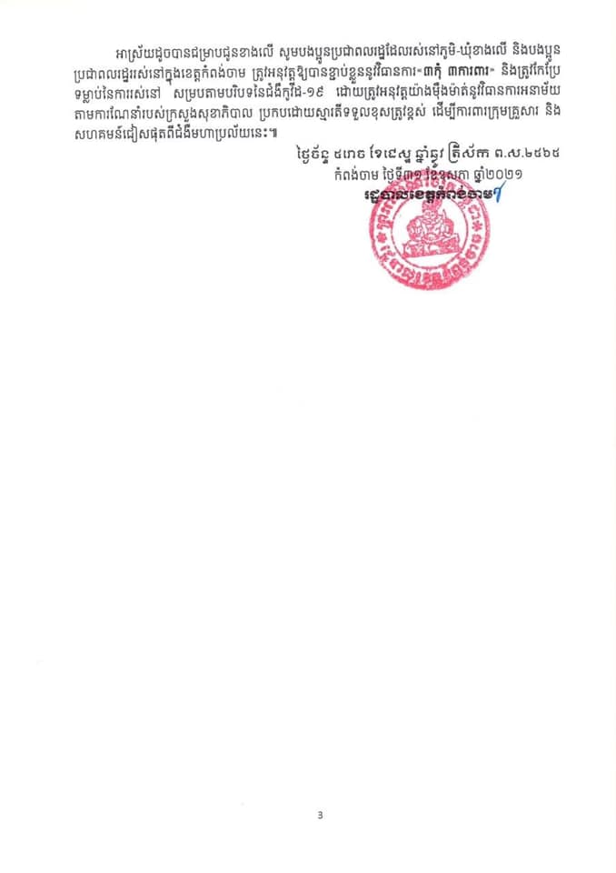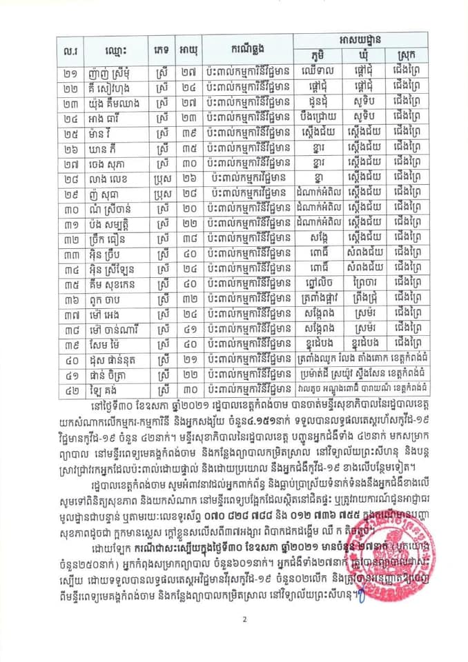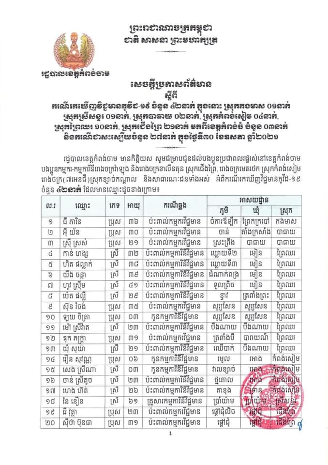គួរបញ្ជាក់ថា៖ ខេត្តកំពង់ចាម ថ្ងៃទី៣០ ខែឧសភា ឆ្នាំ២០២១ម្សិលមិញនេះ បានរកឃើញអ្នកវិជ្ជមានជំងឺកូវីដ-១៩ថ្មីចំនួន ៤២ នាក់ ក្នុងនោះស្រុក កងមាស ០១នាក់ ស្រុកស្រីសន្ទរ០១នាក់ ស្រុកបាធាយ០២នាក់ ស្រុកកំពង់សៀម ០៤នាក់ ស្រុកព្រៃឈរ ១០នាក់ ស្រុកជើងព្រៃ ២១នាក់ មកពីខេត្តកំពង់ធំចំនួន ០៣នាក់ និងករណីជាសៈស្បើយចំនួន ២៧នាក់ ៕