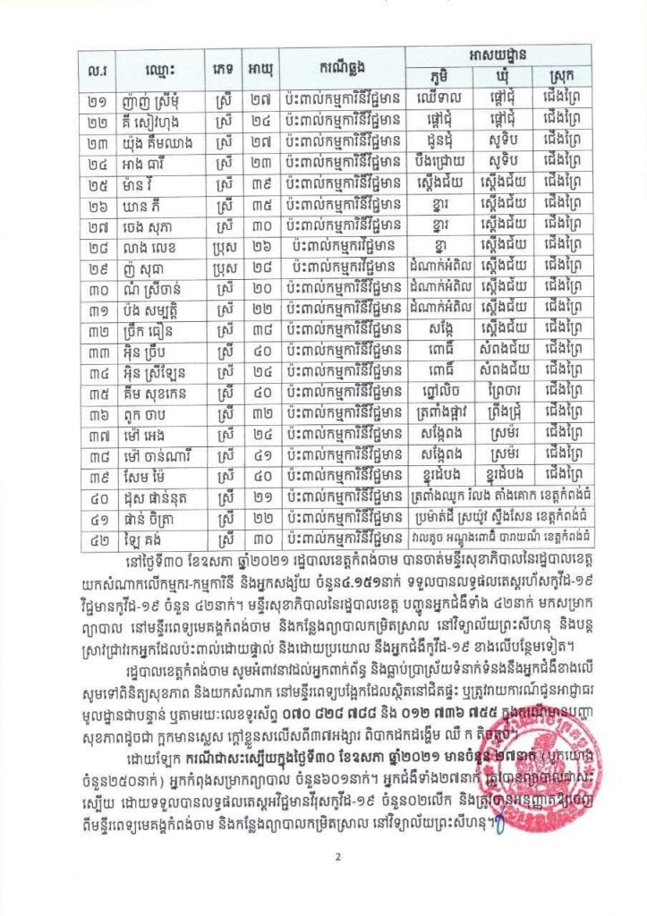 អត្តសញ្ញាណអ្នកវិជ្ជមានកូវីដ១៩ចំនួន ៤២នាក់ និងជាសះស្បើយចំនួន ២៧នាក់ នៅខេត្តកំពង់ចាម រកឃើញថ្ងៃទី៣០ ឧសភា ២០២១One-Minuteអត្ថបទដោយ៖AMS OneMinute AMS OneMinuteអត្ថបទមុនអត្ថបទបន្ទាប់