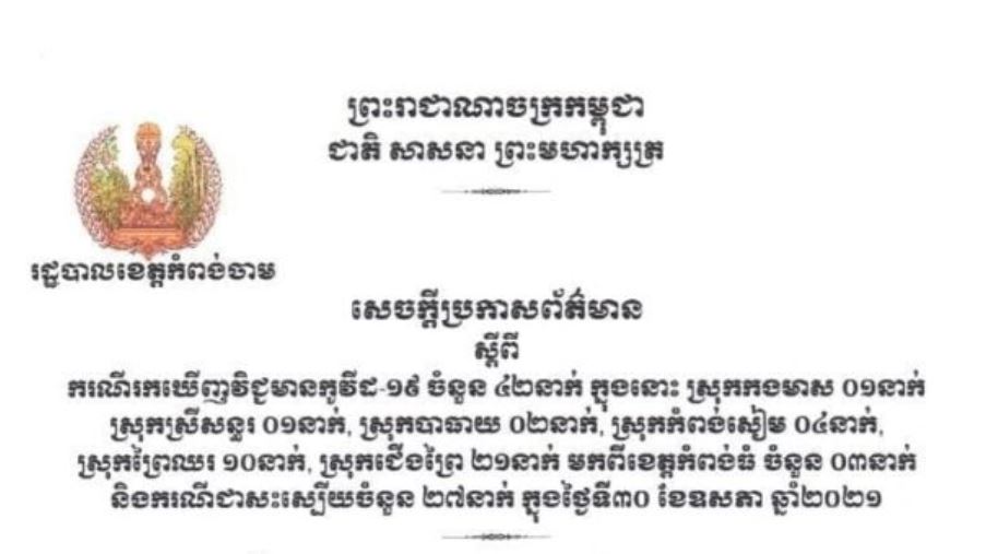 ខេត្តកំពង់ចាមរកឃើញអ្នកវិជ្ជមានកូវីដ-១៩ ចំនួន ៤២នាក់បន្ថែមទៀត និងមានអ្នកជាសះស្បើយ ២៧នាក់ក្នុងរយៈពេល២៤ម៉ោងចុងក្រោយ