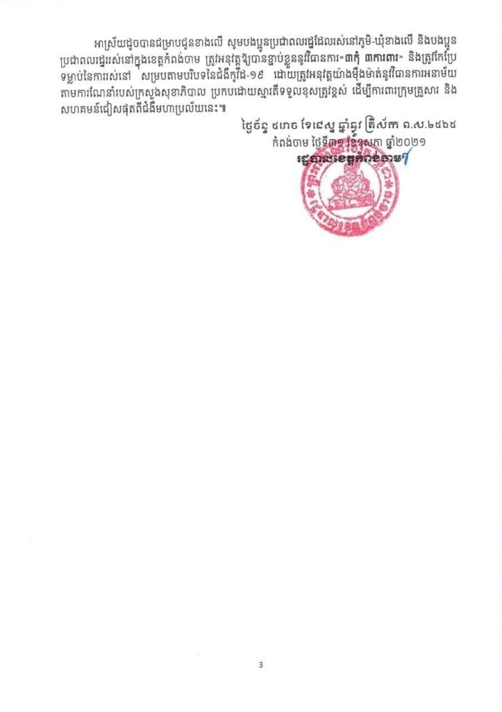 ជាមួយគ្នានោះ រដ្ឋបាលខេត្តកំពុងបន្តស្រាវជ្រាវរកអ្នកដែលប៉ះពាល់ដោយផ្ទាល់ និងប្រយោលបន្ថែមទៀត។ រដ្ឋបាលខេត្តកំពង់ចាមបានអំពាវនាវឲ្យអ្នកដែលពាក់ពន្ធ័នឹងអ្នកជំងឺកូវីដ-១៩ទាំង៤២នាក់នោះ ត្រូវទៅពិនិត្យសុខភាព និងយកសំណាកនៅមន្ទីរពេទ្យបង្អែកដែលស្ថិតនៅជិតផ្ទះ ឬត្រូវរាយការណ៍ជូនអាជ្ញាធរមូលដ្ឋានជាបន្ទាន់។ ជាមួយគ្នានោះ រដ្ឋបាលខេត្តបានឲ្យដឹងថា នៅថ្ងៃទី៣០ឧសភា ខេត្តកំពង់ចាមមានអ្នកជាសះស្បើយពីជំងឺកូវីដ-១៩ចំនួន២៧នាក់ផងដែរ។ គិតត្រឹមថ្ងៃទី៣០ឧសភា ខេត្តកំពង់ចាមមានអ្នកឆ្លងជំកូវីដ-១៩ចំនួន៨៥១នាក់ ក្នុងនោះបានព្យាបាលជាសះស្បើយចំនួនា២៥០នាក់ និងនៅសល់៦០១នាក់កំពុងទទួលការព្យាបាល។