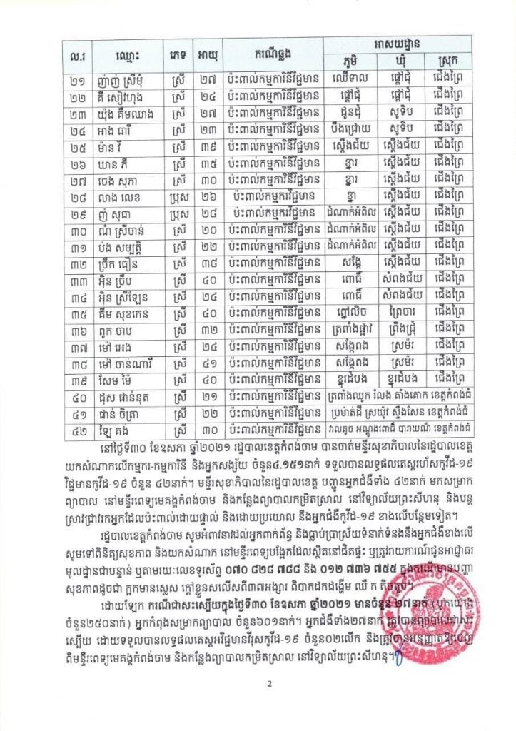 យោងតាមសេចក្ដីជូនដំណឹងរបស់រដ្ឋបាលខេត្តកំពង់ចាមបានឲ្យដឹងថា ក្នុងថ្ងៃ៣០ឧសភា រដ្ឋបាលខេត្តបានចាត់មន្ទីរសុខាភិបាលខេត្តយកសំណាកធ្វើតេស្ដរហ័សកូវីដ-១៩ លើអ្នកសង្ស័យចំនួន៤ពាន់១៥១នាក់ ដោយទទួលបានលទ្ធផលវិជ្ជមានកូវីដ-១៩ចំនួន៤២នាក់។ ក្នុងនោះចំណោមអ្នកឆ្លងទាំងនោះមាននៅស្រុកកងមាសម្នាក់, ស្រុកស្រីសន្ធរម្នាក់, ស្រុកបាធាយ២នាក់, ស្រុកកំពង់សៀម៤នាក់, ស្រុកព្រៃឈរ១០នាក់, ស្រុកជើងព្រៃ២១នាក់ និងអ្នកមកពីខេត្តកំពង់ធំចំនួន៣នាក់។ អ្នកជំងឺទាំង៤២នាក់នោះ ត្រូវបានបញ្ជូនទៅសម្រាកព្យាបាលនៅមន្ទីរពេទ្យមេគង្គកំពង់ចាម និងវិទ្យាល័យព្រះសីហនុ។