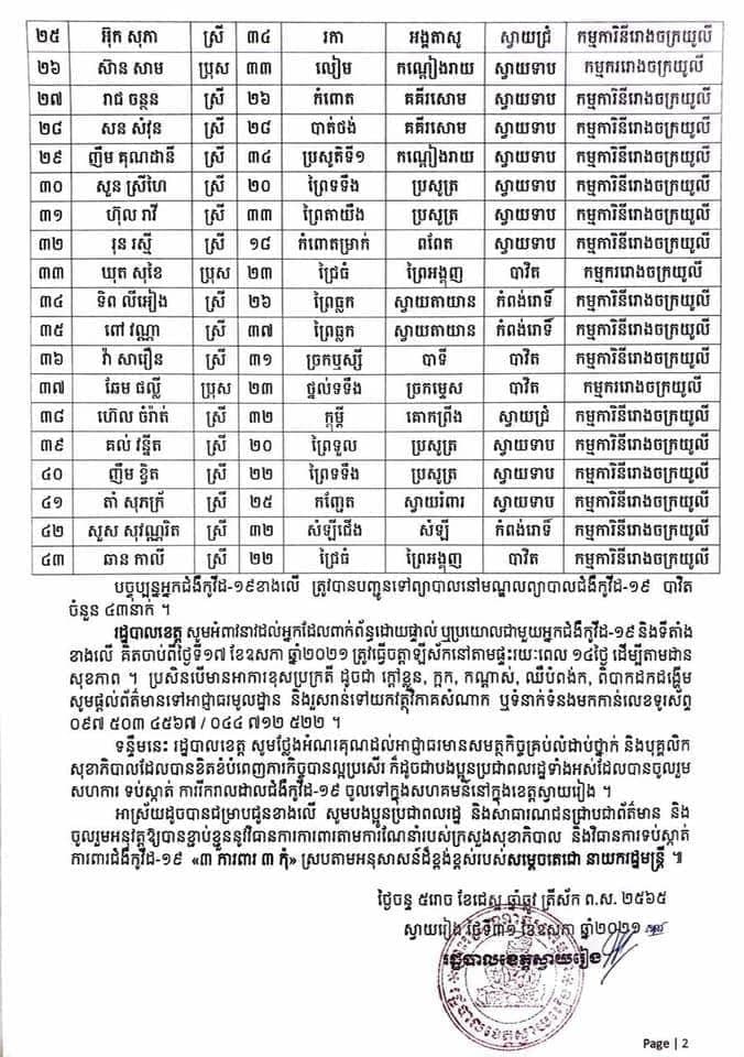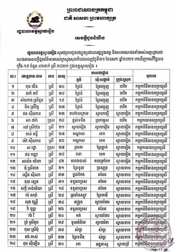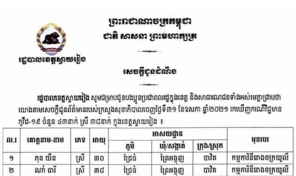 យោងតាមសេចក្ដីជូនដំណឹងរបស់រដ្ឋបាលខេត្តស្វាយរៀងនៅថ្ងៃទី៣១ឧសភាឆ្នាំ២០២១នេះ បានឲ្យដឹងថា រដ្ឋបាលខេត្ត បានរកឃើញករណីវិជ្ជមានវីរុសកូវីដ-១៩ លើចំនួន៤៣នាក់។ អ្នកឆ្លងទាំង៤៣នោះ ជាកម្មករ កម្មការិនីនៅរោងចក្រ យូលី ស្ថិតនៅក្រុងបាវិត ខេត្តស្វាយរៀង។ រដ្ឋបាលខេត្តស្វាយរៀង បានអំពាវនាវដល់អ្នកផ្សេងទៀត ដែលមានពាក់ពន្ធ័ ឬដឹងខ្លួនថាបានប៉ះពាល់ដោយផ្ទាល់ ឬដោយប្រយោលជាមួយអ្នកវិជ្ជមានកូវីដ-១៩ទាំងនោះ ចាប់តាំងពីថ្ងៃ១៧ឧសភាមក ត្រូវធ្វើចត្តាឡីស័កនៅតាមផ្ទះរយៈពេល១៤ថ្ងៃ។ ប្រសិនបើមានបញ្ហាសុខភាពប្រែប្រួល ត្រូវផ្ដល់ព័ត៌មានទៅកាន់ទូរសព្ទ័លេខ ០៩៧ ៥០៣ ៤៥៦៧ ឬ០៤៤ ៧១២ ៥២២។