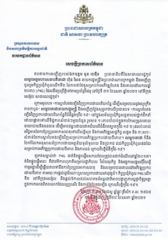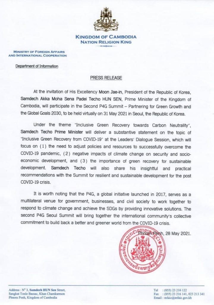 ភ្នំពេញ៖ យោងតាមសេចក្តីប្រកាសព័ត៌មាន របស់ក្រសួងការបរទេស និងសហប្រតិបត្តិការអរជាតិ បាន ឱ្យដឹងថា តបតាមការអញ្ជើញរបស់ឯកឧត្តម មូន ចេអ៊ីន ប្រធានាធិបតី នៃសាធារណរដ្ឋកូរ៉េ សម្តេច អគ្គមហាសេនាបតីតេជោ ហ៊ុន សែន នាយករដ្ឋមន្ត្រី នៃព្រះរាជាណាចក្រកម្ពុជា នឹងអញ្ជើញចូលរួម កិច្ចប្រជុំ កំពូល លើកទី២ នៃភាពជាដៃគូសម្រាប់ការអភិវឌ្ឍបៃតង និងគោលដៅសកលឆ្នាំ២០៣០ (P4G) ដែលនឹងប្រព្រឹត្តិទៅតាមប្រព័ន្ធវីដេអូ នៅម៉ោងប្រមាណ ៨យប់ថ្ងៃទី៣១ ខែឧសភា ឆ្នាំ២០២១ នៅទីក្រុងសេអ៊ូល សាធារណរដ្ឋកូរ៉េ ។