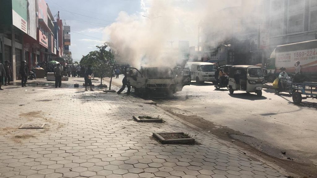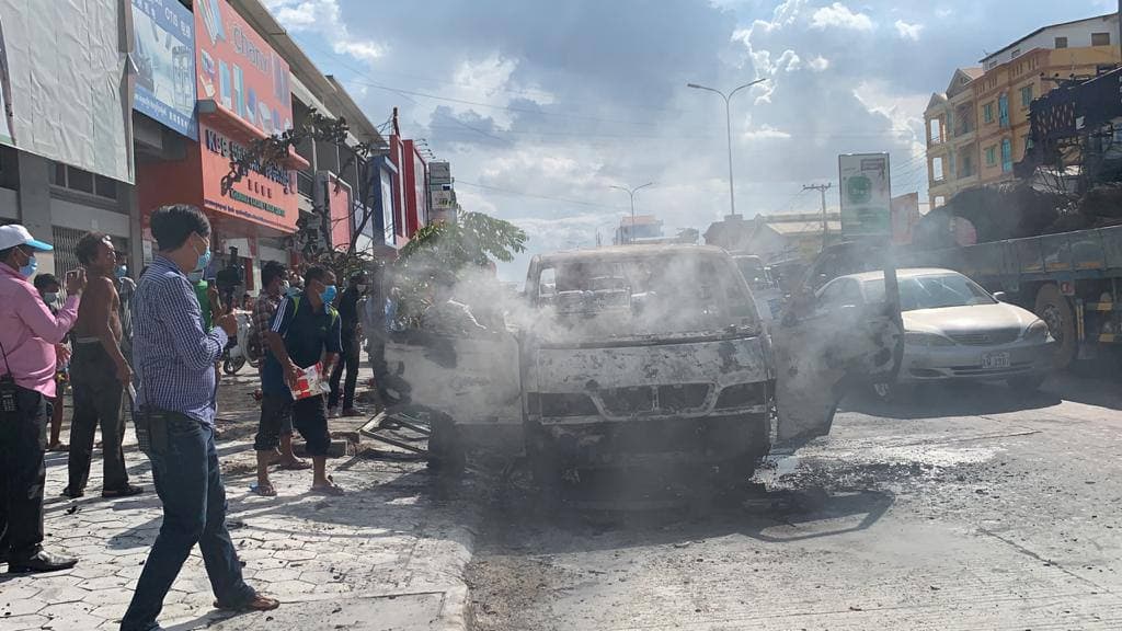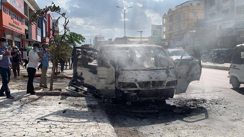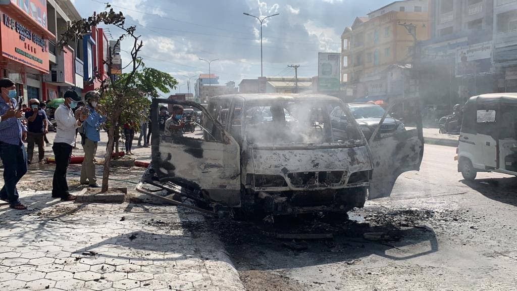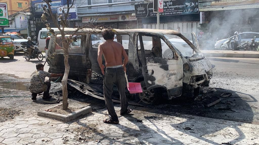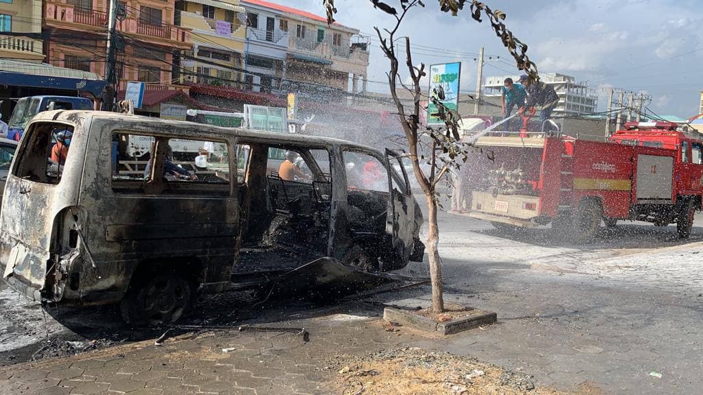 រថយន្តសាំយ៉ុងមួយគ្រឿង ឆ្លងចរន្តអគ្គិសនីឆាបឆេះយ៉ាងសន្ធោសន្ធៅសល់តែគ្រោងឆ្អឹង