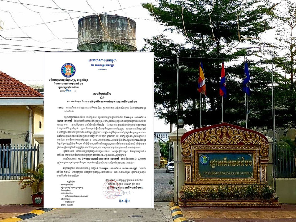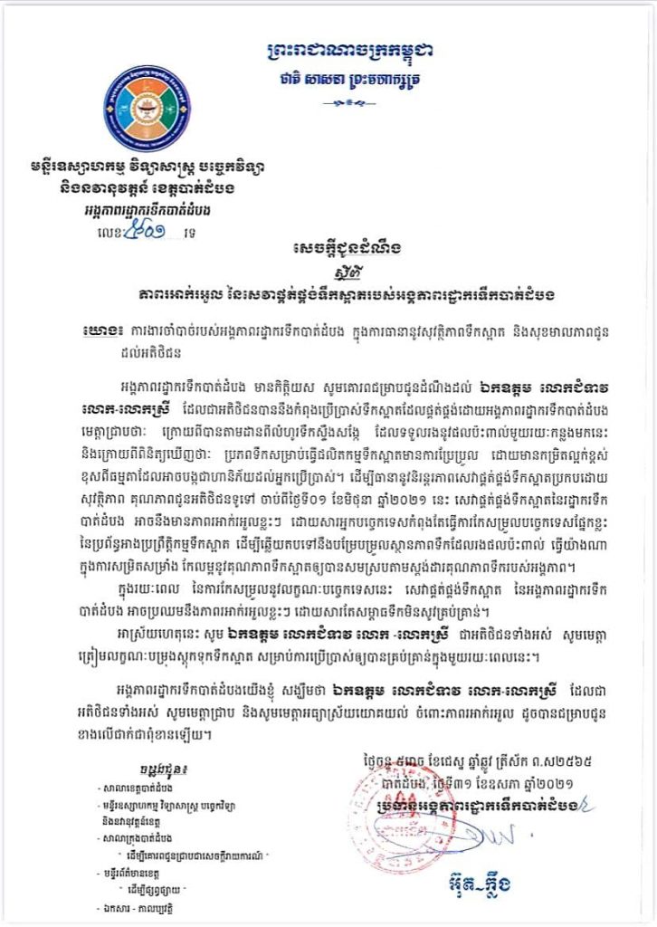 អង្គភាពនៃរដ្ឋាករទឹក ខេត្តបាត់ដំបងបានជូនសេចក្តីជូនដំណឹងស្តីពីភាពរអាក់រអួល ក្នុងការផ្តល់ នូវសេវាផ្គត់ផ្គង់ទឹកស្អាត