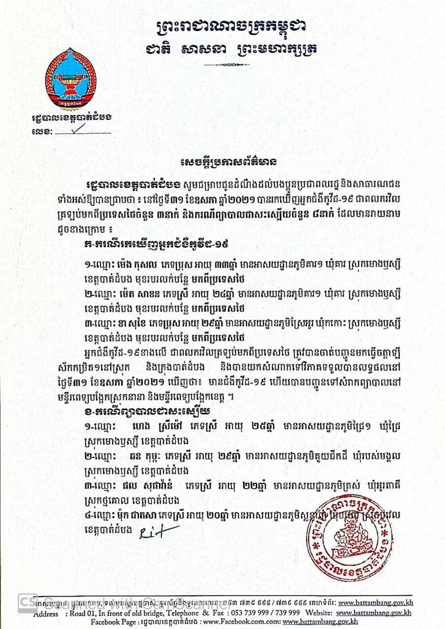 រដ្ឋបាលខេត្តបាត់ដំបង បានចេញសេចក្តីប្រកាសព័ត៌មាន និង ជូនដំណឹង នៅល្ងាច ថ្ងៃទី៣១ ខែឧសភាឆ្នាំ២០២១នេះ ពីករណីរកឃើញ វិជ្ជមានជម្ងឺកូវីដ-19 ចំនួន០៣នាក់ ថ្មីបន្ថែមទៀតជាពលករវិលត្រឡប់ពីប្រទេសថៃចំនួន០៣នាក់និងបានព្យាបាលអ្នកជម្ងឺ ឲ្យជាសះស្បើយ ចំនួន០៨នាក់ ត្រូវបានអនុញ្ញាតិឲ្យវិលត្រឡប់ទៅលំនៅដ្ឋានរបស់ខ្លួនវិញផងដែរ។