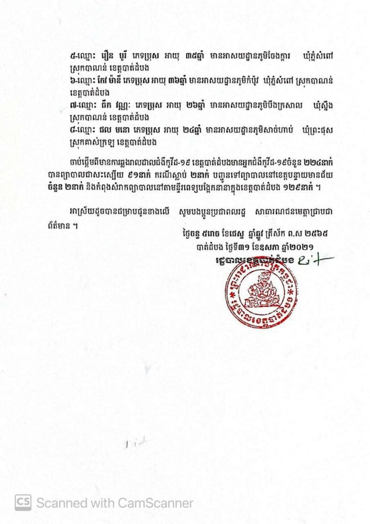 សូមបញ្ជាក់ផងដែរថា៖ តាំងពីចាប់ផ្តើមករណីផ្ទុះជម្ងឺកូវីដ-19កន្លងមក ខេត្តបាត់ដំបង មានអ្នកជម្ងឺកូវីដ-19 សរុបចំនួន២២៤នាក់ ក្នុងនោះ បានព្យាបាលឲ្យជាសះស្បើយ ចំនួន៩១នាក់,ស្លាប់២ករណី បានបញ្ជូនឲ្យទៅសម្រាកព្យាបាលនៅខេត្តបន្ទាយមានជ័យ ចំនួន០២នាក់ និងកំពុងសម្រាកព្យាបាលជម្ងឺនៅតាមមន្ទីរពេទ្យបង្អែកនានាសរុបចំនួន ១២៩នាក់។