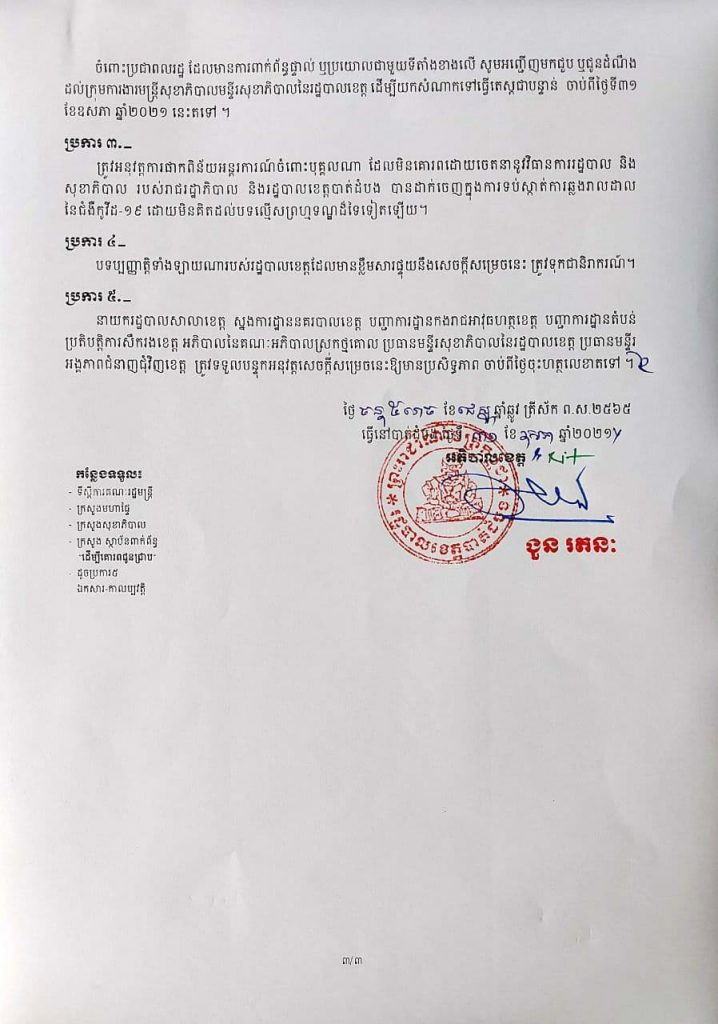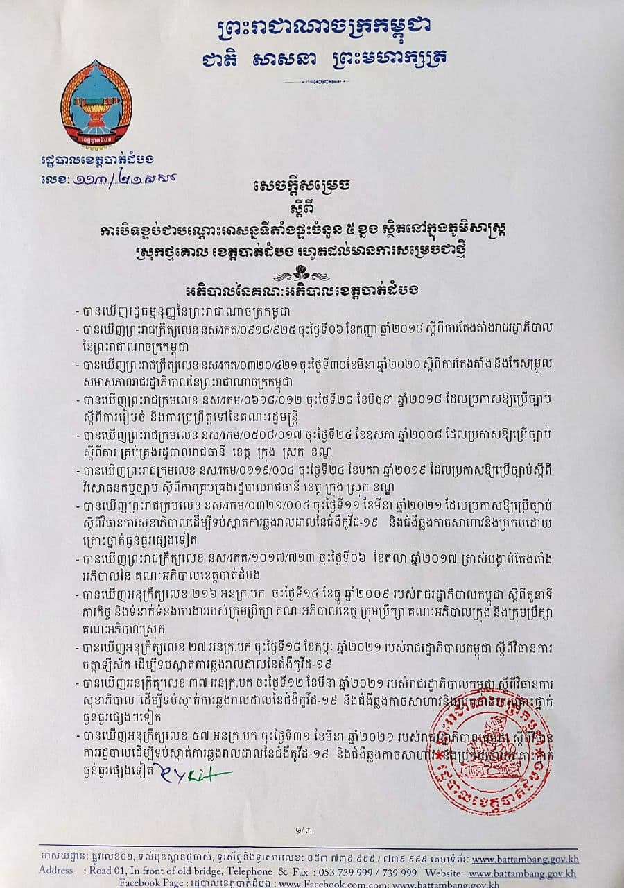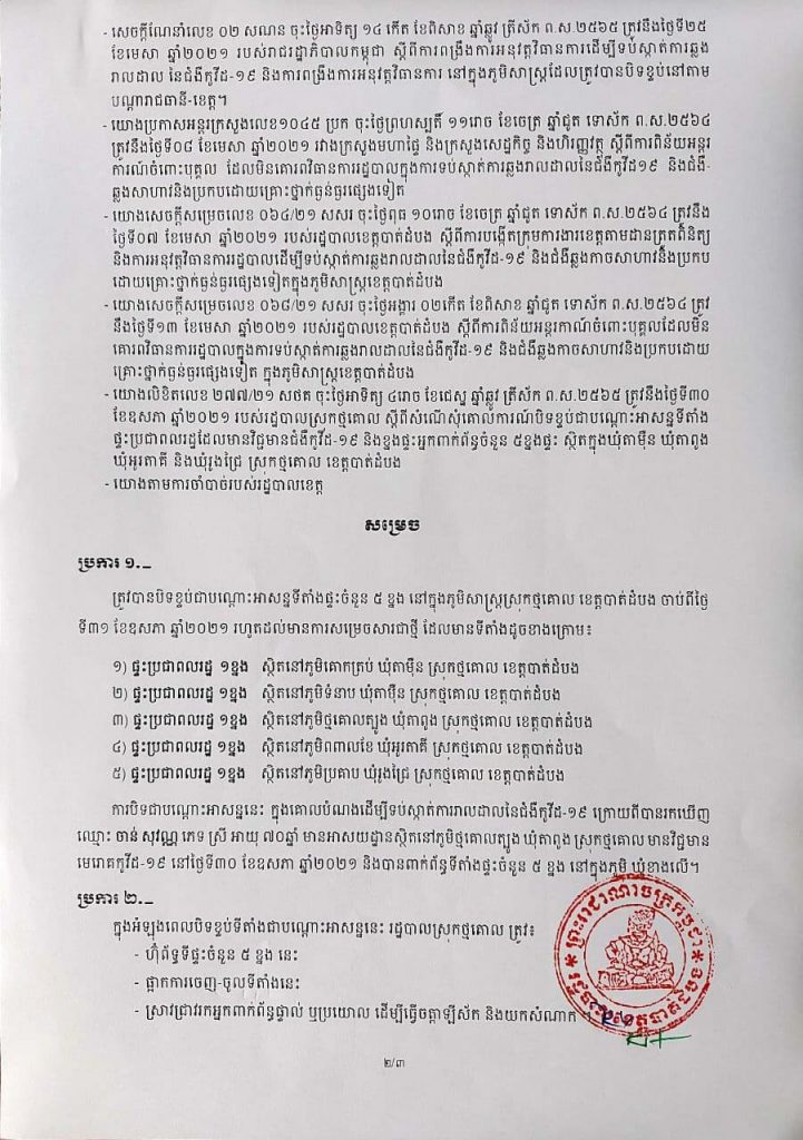 ការបិទខ្ទប់នេះគឺធ្វើឡើងយោងសេចក្តីសម្រេច របស់ រដ្ឋបាលខេត្តបាត់ដំបង លេខ១១៣/២១សសរ. ចុះថ្ងៃទី ៣១ ខែឧសភា ឆ្នាំ២០២១ ស្តីពីការបិទខ្ទប់នូវខ្នងផ្ទះ ចំនួន០៥ខ្នង ខាងលើ រហូតដល់មានការជូនដំណឹងជាថ្មី។ដូចមានចែងក្នុងខ្លឹមសាររួមនៃសេចក្តីសម្រេចដែលជូនភ្ជាប់មកជាមួយខាងក្រោមនេះ៖