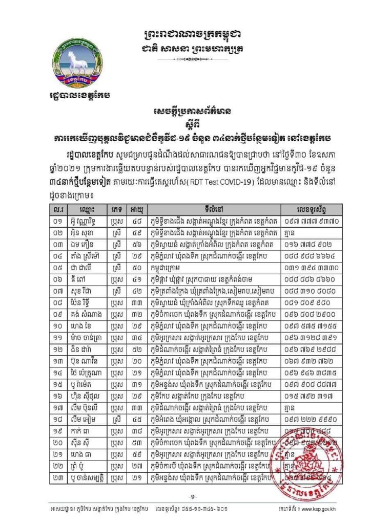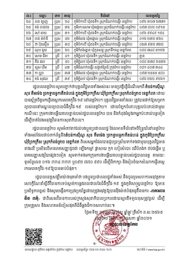 អត្តសញ្ញាណអ្នកវិជ្ជមានកូវីដ១៩ចំនួន ៣៤នាក នៅខេត្តកែប រកឃើញថ្ងៃទី៣០ ឧសភា ២០២១One-Minuteអត្ថបទដោយ៖AMS OneMinute AMS OneMinuteអត្ថបទមុនអត្ថបទបន្ទាប់