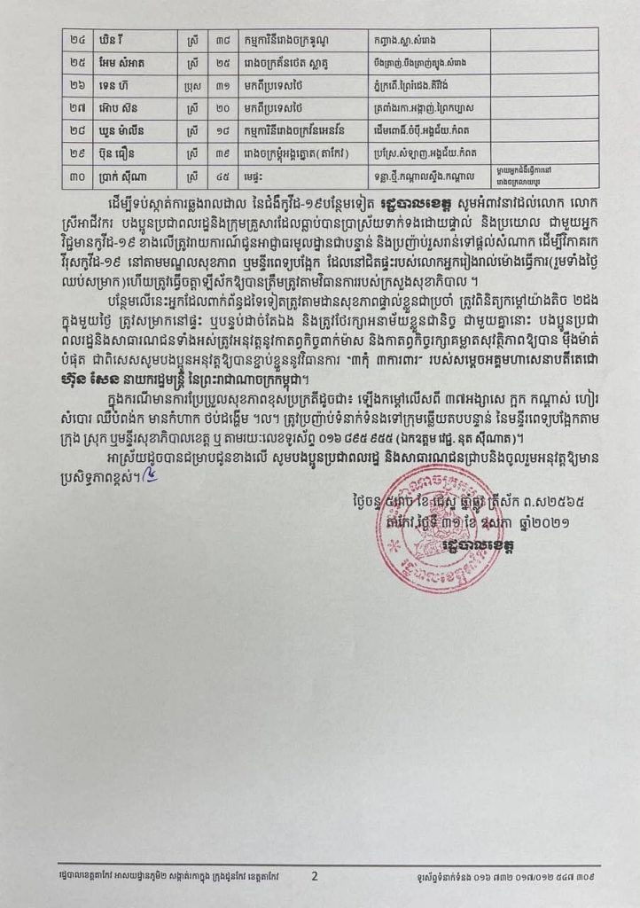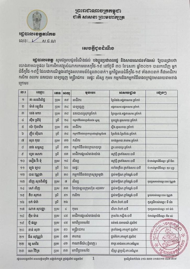អត្តសញ្ញាណអ្នកវិជ្ជមានកូវីដ១៩ចំនួន ៣០នាក់ នៅខេត្តតាកែវ រកឃើញថ្ងៃទី៣០ ឧសភា ២០២១One-Minuteអត្ថបទដោយ៖AMS OneMinute AMS OneMinuteអត្ថបទមុនអត្ថបទបន្ទាប់