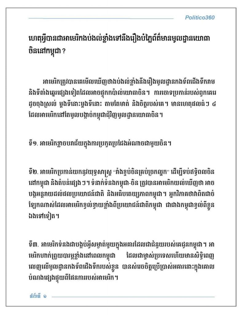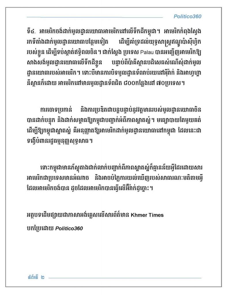 “ការចោទប្រកាន់ និងការប្រឌិតជាបន្តបន្ទាប់នូវវត្តមានរបស់មូលដ្ឋានយោធាចិន បានដាក់បន្ទុក និងដាក់សម្ពាធឱ្យកម្ពុជាបញ្ជាក់ពីភាពស្អាតស្អំ។ មធ្យោបាយតែមួយគត់ដើម្បីឱ្យកម្ពុជាស្អាតស្អំ គឺអនុញ្ញាតឱ្យអាមេរិកដាក់មូលដ្ឋានយោធានៅកម្ពុជា ដែលនេះជាទង្វើបំពានរដ្ឋធម្មនុញ្ញសុទ្ធសាធ។”