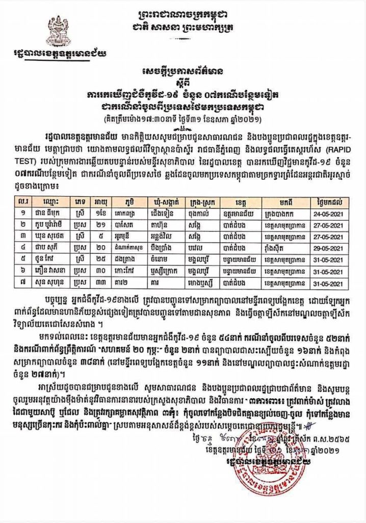 អត្តសញ្ញាណអ្នកវិជ្ជមានកូវីដ១៩ ចំនួន០៧នាក់ នៅខេត្តឧត្តរមានជ័យOne-Minuteអត្ថបទដោយ៖AMS OneMinute ៣១ ឧសភា ២០២១ AMS OneMinuteអត្ថបទមុនអត្ថបទបន្ទាប់