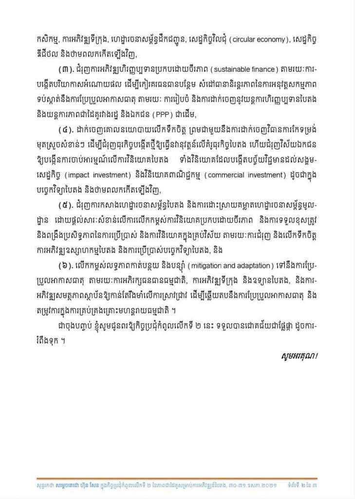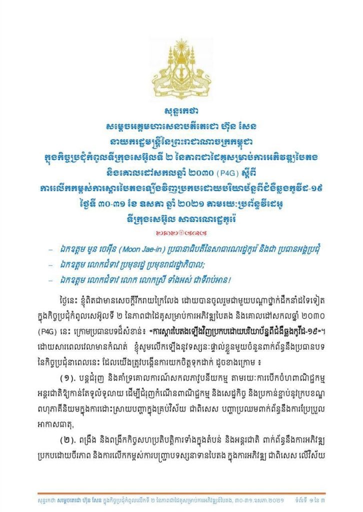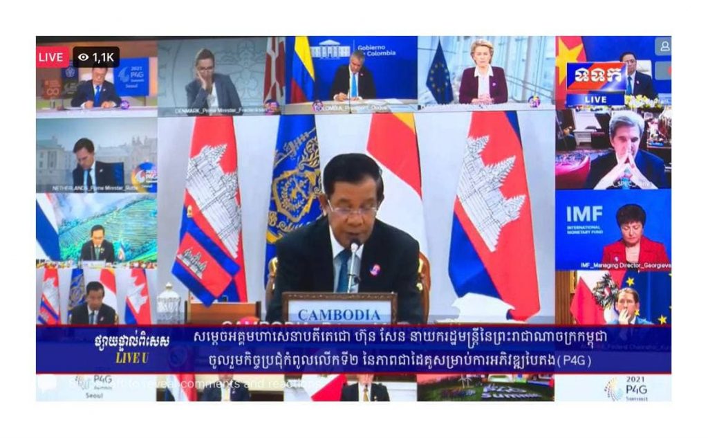 សុន្ទរកថាសម្តេចតេជោនាយករដ្ឋមន្ត្រីក្នុងកិច្ចប្រជុំកំពូលលើកទី២ នៃភាពជាដៃគូសម្រាប់ការអភិវឌ្ឍបៃតង និងគោលដៅសកលឆ្នាំ២០៣០ ( P4G ) ស្តីពីការលើកកម្ពស់ការស្តារបៃតងឡើងវិញប្រកបដោយបរិយាប័ន្នពីជំងឺឆ្លងកូវីដ១៩ តាមរយៈប្រព័ន្ធវីដេអូ ថ្ងៃទី៣១ ឧសភា ២០២១។