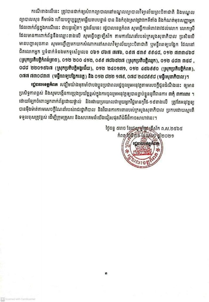 រដ្ឋបាលខេត្តកំពតនៅថ្ងៃទី៣១ ខែឧសភា ឆ្នាំ២០២១នេះ បានបន្តរកឃើញអ្នកឆ្លងជំងឺកូវីដ-១៩ចំនួន៥៥នាក់បន្ថែមទៀត ដែលជាបុគ្គលិក និងប្រជាពលរដ្ឋជាអ្នកបានចូលទៅលេងល្បែងនៅក្នុងកាស៊ីណូសុខ គឹមម៉េង ស្ថិតនៅច្រកទ្រារភាគីតន់ហន់ ស្ថិតនៅភូមិព្រែកក្រឹស ឃុំព្រែកក្រឹស ស្រុកកំពង់ត្រាច។