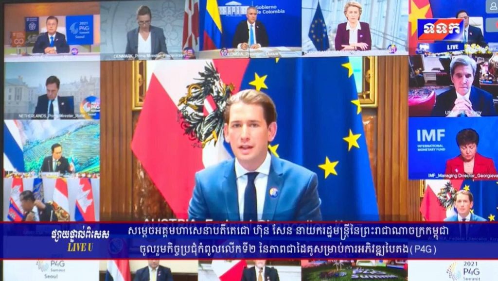 សម្តេចតេជោ នាយករដ្ឋមន្រ្តី បានចែករំលែកទស្សនៈផ្ទាល់ខ្លួន៦ចំណុចជាមួយថ្នាក់ដឹកនាំកំពូលពិភពលោកនៅក្នុងប្រជុំកំពូលទីក្រុងសេអ៊ូលលើកទី២ នៃភាពជាដៃគូសម្រាប់ការអភិវឌ្ឍន៍បៃតង និងគោលដៅសកលឆ្នាំ២០៣០ (P4G) នារាត្រីថ្ងៃទី៣១ ខែឧសភា ឆ្នាំ២០២១ រួមមាន៖
