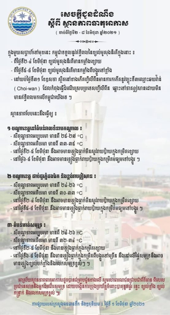 ក្រសួងធនធានទឹក នៅថ្ងៃទី១មិថុនាឆ្នាំ២០២១ បានចេញសេចក្ដីជូនដំណឹងស្ដីពីការព្យាករណ៍ស្ថានភាពអាកាសធាតុនៅកម្ពុជាចាប់ពីថ្ងៃទី២ដល់ថ្ងៃទី៨មិថុនា។ ក្រសួងធនធានទឹកបានឲ្យដឹងថា ក្នុងរយៈពេល១សប្ដាហ៏ទៅមុខ កម្ពុជានឹងទទួលរងនូវឥទ្ធិពលនៃខ្យល់មូសុងនិរតីមានកម្លាំងខ្សោយចាប់ពីថ្ងៃទី២ដល់ថ្ងៃទី៤មិថុនា និងចាប់ពីថ្ងៃទី៥ដល់ថ្ងៃទី៨មិថុនា ខ្យល់មូសុងនិរតីនឹងមានកម្លាំងពីបង្គួរទៅខ្លាំង។