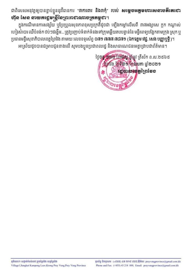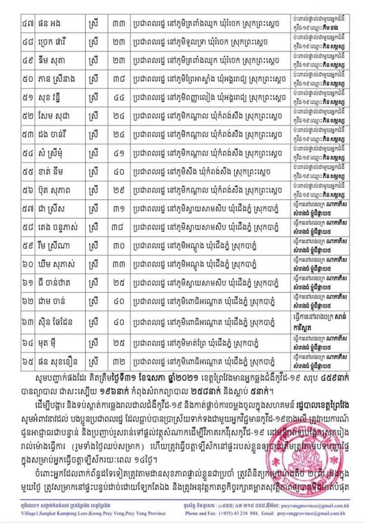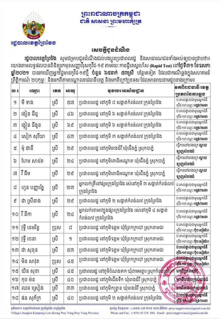 អត្តសញ្ញាណអ្នកវិជ្ជមានកូវីដ១៩ ចំនួន៦៤នាក់ នៅខេត្តព្រៃវែង រកឃើញថ្ងៃទី៣១ ឧសភា ២០២១One-Minuteអត្ថបទដោយ៖AMS OneMinute AMS OneMinuteអត្ថបទមុនអត្ថបទបន្ទាប់