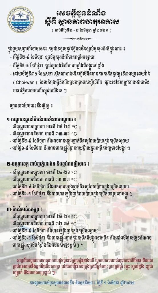 ស្ថានភាពធាតុអាកាស ០២-០៨ មិថុនា ២០២១
