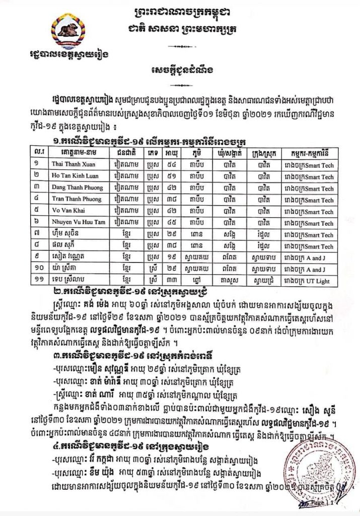 យោងតាមសេចក្ដីជូនដំណឹងរបស់រដ្ឋបាលខេត្តស្វាយរៀង បានឲ្យដឹងថា នៅថ្ងៃទី៣១ឧសភាឆ្នាំ២០២១ រដ្ឋបាលខេត្ត បានរកឃើញករណីវិជ្ជមានវីរុសកូវីដ-១៩ លើចំនួន១១នាក់។ អ្នកឆ្លងទាំង១១នោះ ជាកម្មករ កម្មការិនីនៅរោងចក្រ Smart Tech ចំនួន៨នាក់, រោងចក្រ A and J ចំនួន២នាក់ និងរោងចក្រ UT Light ម្នាក់។ ក្នុងចំណោអ្នកឆ្លងទាំង១១នាក់នោះ មានជនជាតិវៀតណាម៦នាក់ និងជនជាតិខ្មែរ៥នក់។