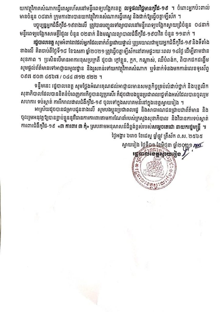 ខេត្តស្វាយរៀង រកឃើញអ្នកវិជ្ជមានកូវីដ-១៩ ចំនួន ១១នាក់ក្នុងរយៈពេល ២៤ម៉ោងចុងក្រោយ