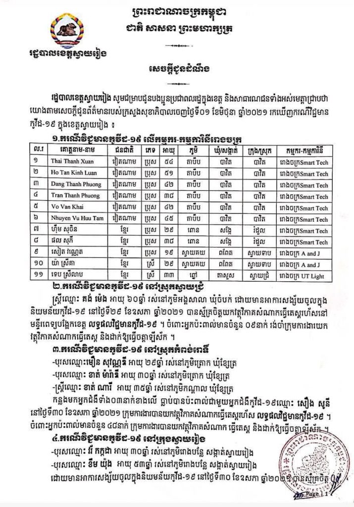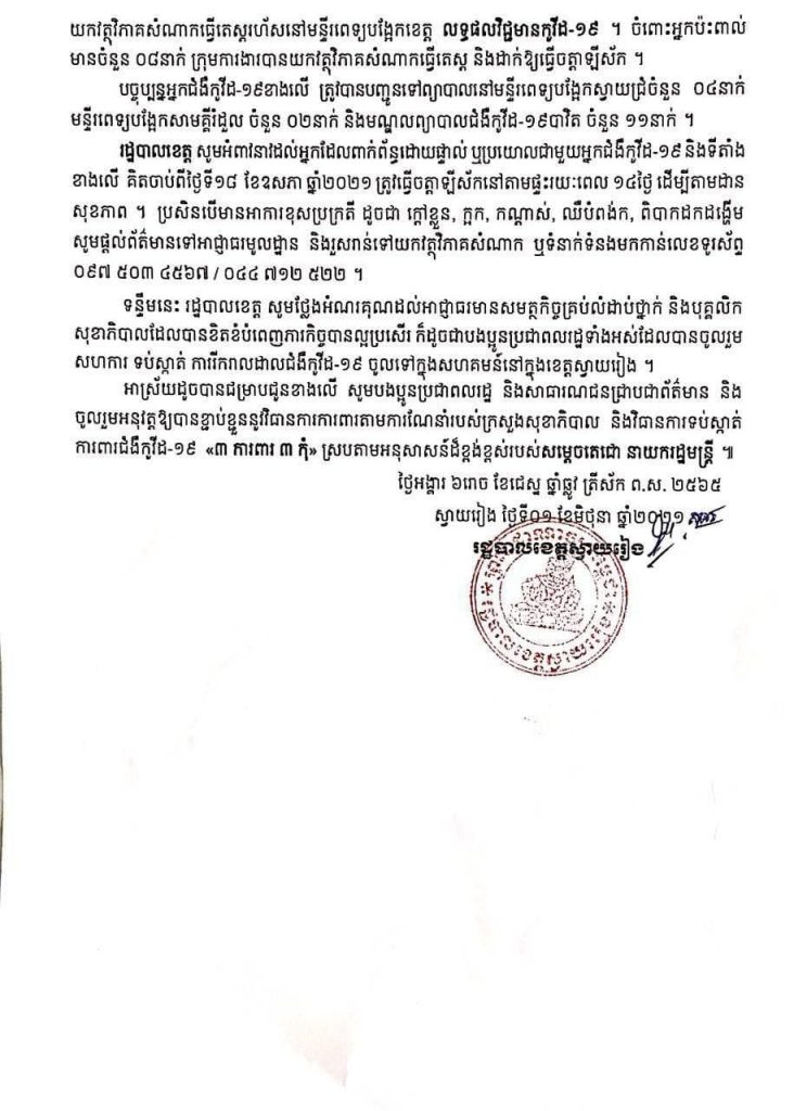 អត្តសញ្ញាណអ្នកវិជ្ជមានកូវីដ១៩ចំនួន ១៧នាក់ នៅស្វាយរៀង រកឃើញថ្ងៃទី៣១ ឧសភា ២០២១One-Minuteអត្ថបទដោយ៖AMS OneMinute AMS OneMinuteអត្ថបទមុនអត្ថបទបន្ទាប់