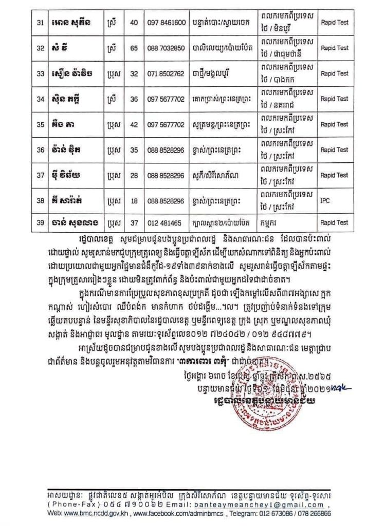 អាជ្ញាធរខេត្តបន្ទាយមានជ័យនៅថ្ងៃ១មិថុនា បានជូនដំណឹងថា គេបានបន្តរកឃើញអ្នកឆ្លងជំងឺកូវីដ-១៩ ចំនួន៣៩នាក់នៅថ្ងៃទី៣១ឧសភា។ ក្នុងចំណោមអ្នកកឆ្លងថ្មីទាំងនោះ មាន៩នាក់នៅក្រុងប៉ោយប៉ែត និងមកពីប្រទេសថៃចំនួន៣០នាក់។ រដ្ឋបាលខេត្តបន្ទាយមានជ័យ បានអំពាវនាវដល់ ប្រជាពលរដ្ឋទាំងអស់ ដែលបានប៉ះពាល់ផ្ទាល់ និងប្រយោលជាមួយអ្នកជំងឺកូវីដ-១៩ទាំងនោះ ត្រូវប្រញាប់ធ្វើចត្តាឡីស័ក និងប្រញាប់ទំនាក់ទំនងទៅអាជ្ញារមូលដ្ឋាន ដើម្បីទៅធ្វើតេស្តរកមេរោគកូវីដ-១៩ នៅតាមមណ្ឌលសុខភាព ឬមន្ទីរពេទ្យបង្អែកដែលនៅជិតបំផុត។ ជាមួយគ្នានោះ រដ្ឋបាលខេត្តបន្ទាយមានជ័យបានបញ្ជាក់ថា នៅថ្ងៃនេះ ក៏មានអ្នកជាសះស្បើយពីជំងឺកូវីដ-១៩ចំនួន៦៦នាក់ផងដែរ។