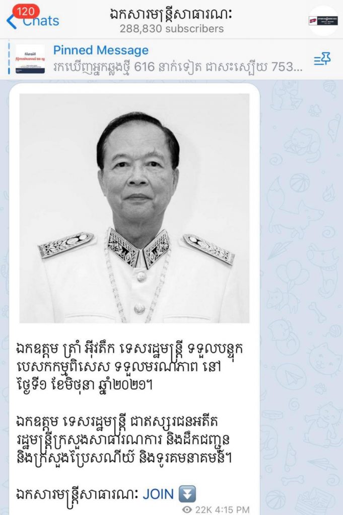 ឯកឧត្ដម ត្រាំ អ៊ីវតឹក ទេសរដ្ឋមន្ត្រី ទទួលបន្ទុកបេសកកម្មពិសេស ទទួលមរណភាព នៅថ្ងៃទី១ ខែមិថុនា ឆ្នាំ២០២១។