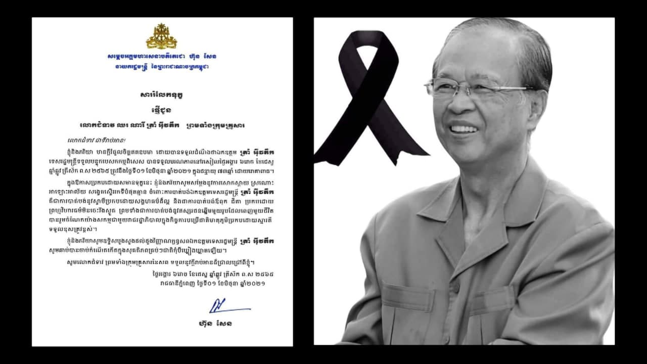 សម្តេចតេជោ ហ៊ុន សែន នាយករដ្ឋមន្រ្តីកម្ពុជា បានផ្ញើសារចូលរួមរំលែកទុក្ខ ចំពោះមរណភាពរបស់ ឯ,ឧ ត្រាំ អ៉ីវតឹក ទេសរដ្ឋមន្ដ្រីទទួលបន្ទុកបេសកកម្មពិសេស ដែលបានទទួលមរណភាព នៅរសៀលថ្ងៃទី១ ខែមិថុនា ឆ្នាំ២០២១ ក្នុងជន្មាយុ៧៣ឆ្នាំ ដោយរោគាពាធ។