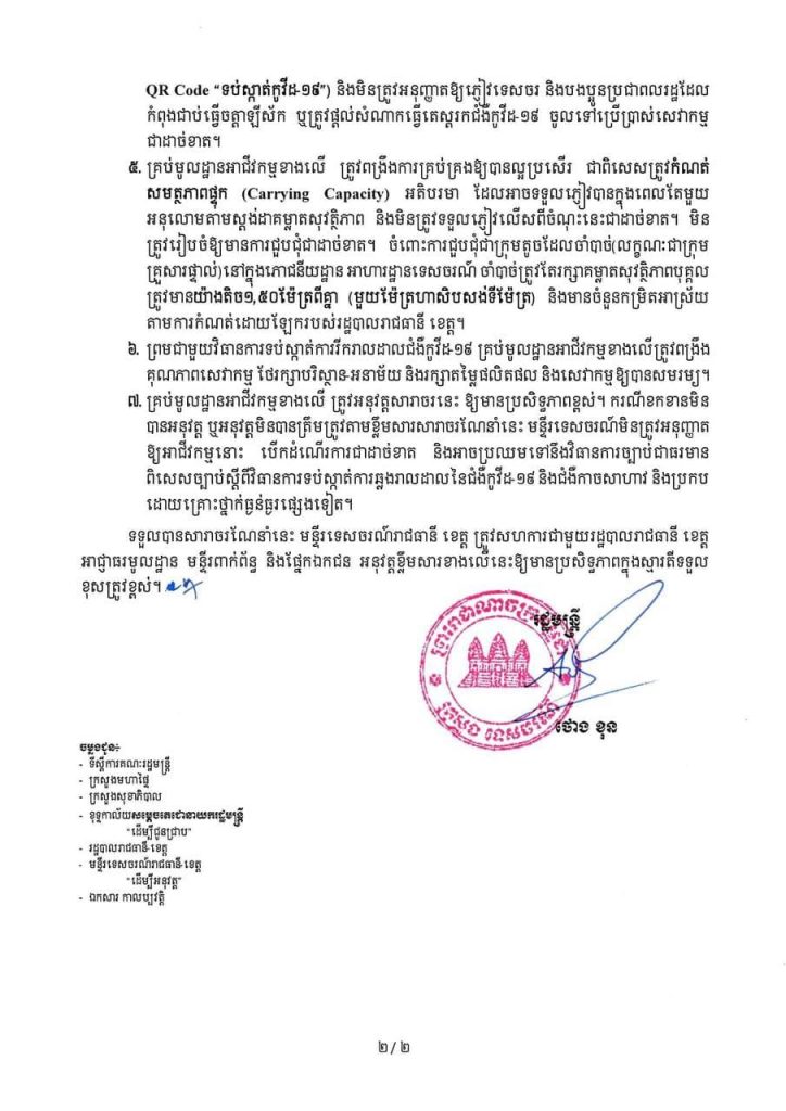 ២៖ មន្ទីរទេសចរណ៍រាជធានី-ខេត្ត ត្រូវបន្តសហការជាមួយរដ្ឋបាលខេត្ត និងអាជ្ញាធរមូលដ្ឋាន ពិនិត្យ និងពង្រឹងបន្ថែមទៀតនូវការអនុវត្តវិធានសុវត្ថិភាពទេសចរណ៍ ចំពោះគ្រប់អាជីវកម្មសេវាកម្មស្នាក់នៅទេសចរណ៍ ភោជនីយដ្ឋាននិងអាហារដ្ឋានទេសចរណ៍។ ដោយឡែក ចំពោះមូលដ្ឋានអាជីវកម្មខាងលើ ដែលស្ថិតនៅក្នុងតំបន់ដែលបានដាក់ចេញវិធានការបិទខ្ទប់ មន្ទីរទេសចរណ៍រាជធានី-ខេត្ត ត្រូវបន្តសហការជាមួយរដ្ឋបាលខេត្ត និងអាជ្ញាធរមូលដ្ឋានបន្តពង្រឹងនូវរាល់វិធានការជាធរមាន។