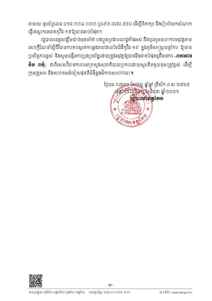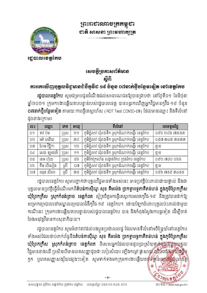 យោងតាមរដ្ឋបាលខេត្តកែបបានឲ្យដឹងថា យោងតាមលទ្ធផលវិភាគវត្ថុសំណាករកមេរោគកូវីដ-១៩ នៅថ្ងៃទី១មិថុនាឆ្នាំ២០២១ គេបានរកឃើញអ្នកវិជ្ជមានកូវីដ-១៩ចំនួន៧នាក់។ រដ្ឋបាលខេត្តបញ្ជាក់ថា អ្នកឆ្លងទាំងនោះរស់នៅឃុំពងទឹក ស្រុកដំណាក់ចង្អើ ខេត្តកែប។ អ្នកទាំងនោះ គឺធ្លាប់បានទៅលេងល្បែងនៅកាស៊ីណូសុខ គឹមម៉េង ច្រកទ្វារភាគីតន់ហន់ ស្ថិតនៅឃុំព្រែកក្រឹស ស្រុកកំពង់ត្រាច ខេត្តកំពត។ ជាមួយគ្នានោះ ក្រុមឆ្លើយតបបន្ទាន់បាន និងកំពុងស្រាវជ្រាវរកទីតាំង និងកំណត់មុខសញ្ញាអ្នកដែលពាក់ពន្ធ័នឹងអ្នកវិជ្ជមានបន្តទៀត។ ជាមួយគ្នានោះ រដ្ឋបាលខេត្តកំពត បានអំពាវនាវឲ្យអ្នកដែលមានការពាក់ពន្ធ័ត្រូវធ្វើចត្តាឡីស័ក តាមការណែនាំរបស់ក្រសួងសុខាភិបាល ហើយប្រសិនបើមានបញ្ហាសុខភាព ត្រូវប្រញាប់ទៅយកសំណាកនៅមន្ទីរពេទ្យបង្អែកដែលនៅជិតបំផុត។