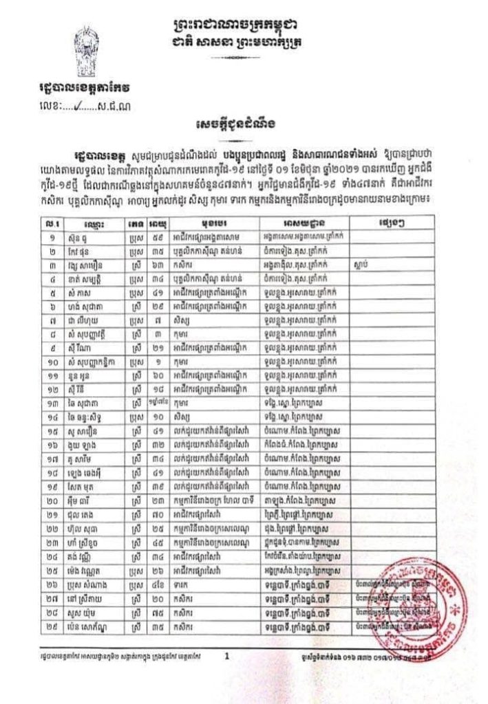 ជាមួយគ្នានោះ រដ្ឋបាលខេត្តតាកែវបានបញ្ជាក់ថា នៅថ្ងៃទី១មិថុនា មានអ្នកស្លាប់ម្នាក់វង្ស សាមឿន អាយុ៦៣ឆ្នាំ មានមុខរបរជាកសិករ នៅភូមិអង្គតាង៉ិល ឃុំគុស ស្រុកត្រាំកក់ ខេត្តតាកែវ។