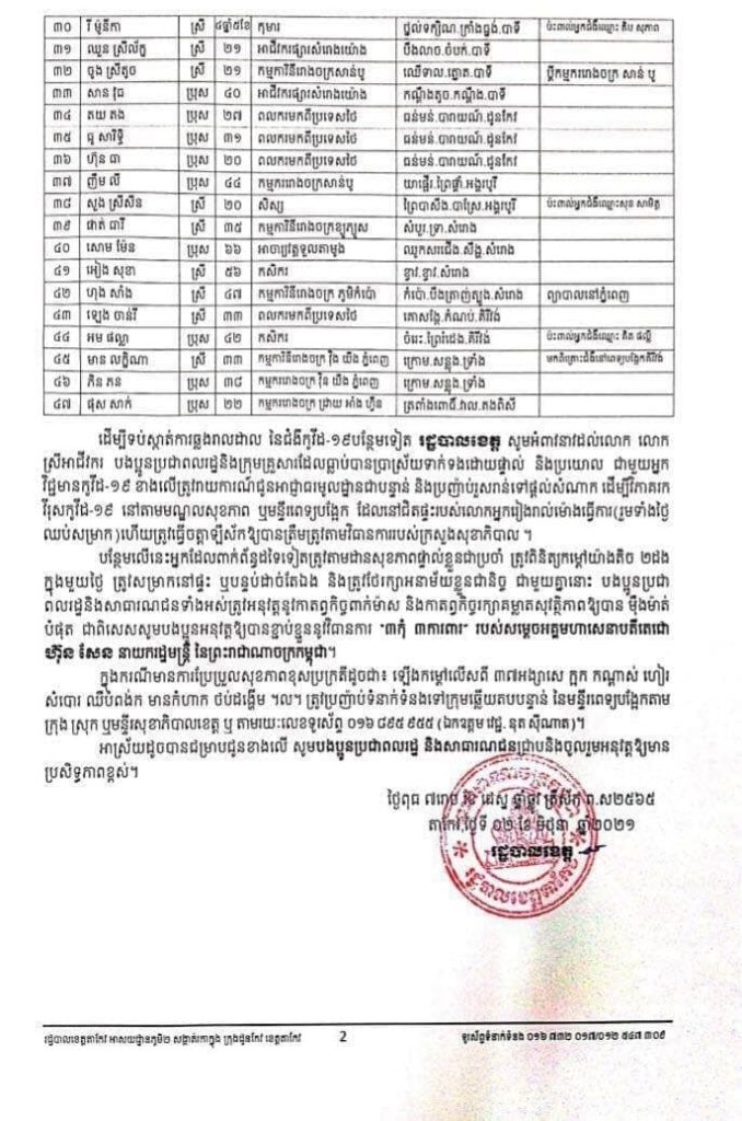 រដ្ឋបាលខេត្តតាកែវបានអំពាវនាវដល់ប្រជាពលរដ្ឋ និងក្រុមគ្រួសារដែលធ្លាប់បានប្រាស្រ័យទាក់ទងដោយផ្ទាល់ និងប្រយោល ជាមួយអ្នកវិជ្ជមានកូវីដ-១៩ទាំ៤៧នាក់នោះ ត្រូវរាយការណ៍ជូនអាជ្ញាធរមូលដ្ឋានជាបន្ទាន់ និងប្រញាប់រួសរាន់ទៅផ្ដល់សំណាក ដើម្បីវិភាគរកវីរុសកូវីដ-១៩ នៅតាមមណ្ឌលសុខភាព ឬមន្ទីរពេទ្យបង្អែក ដែលនៅជិតបំផុត ហើយត្រូវធ្វើចត្តាឡីស័កឲ្យបានត្រឹមត្រូវតាមវិធានការរបស់ក្រសួងសុខាភិបាល។