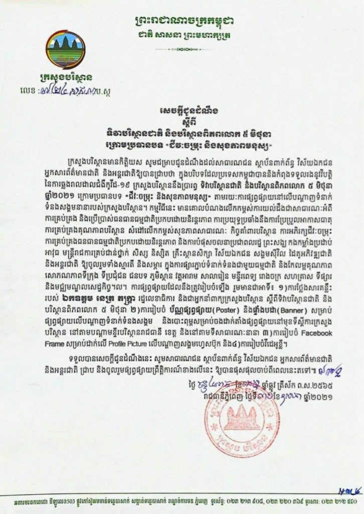 សេចក្តីជូនដំណឹង ស្តីពី ទិវាបរិស្ថានជាតិ និងបរិស្ថានពិភពលោក ៥មិថុនា ក្រោមប្រធានបទ “ជីវៈចម្រុះ និងសុខភាពមនុស្ស”