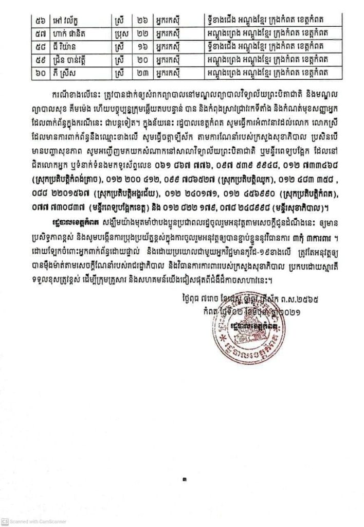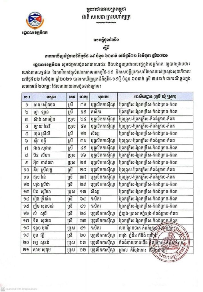 ខេត្តកំពត រកឃើញអ្នកមានវិជ្ជមានកូវីដ-១៩ ថ្មីចំនួន ៦០នាក់