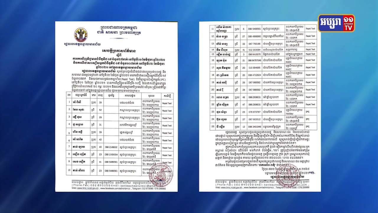 ខេត្តបន្ទាយមានជ័យ រកឃើញអ្នកឆ្លងថ្មី២៥នាក់ (Video Inside)ព័ត៌មានអប្សរាណេតអត្ថបទដោយ៖ឆាយ រត្ថា ឆាយ រត្ថាលោក ឆាយ រត្ថា ជាបុគ្គលិកផ្នែកព័ត៌មានវិទ្យា នៃអគ្គនាយកដ្ឋានវិទ្យុ និងទូរទស្សន៍ អប្សរាអត្ថបទមុនអត្ថបទបន្ទាប់