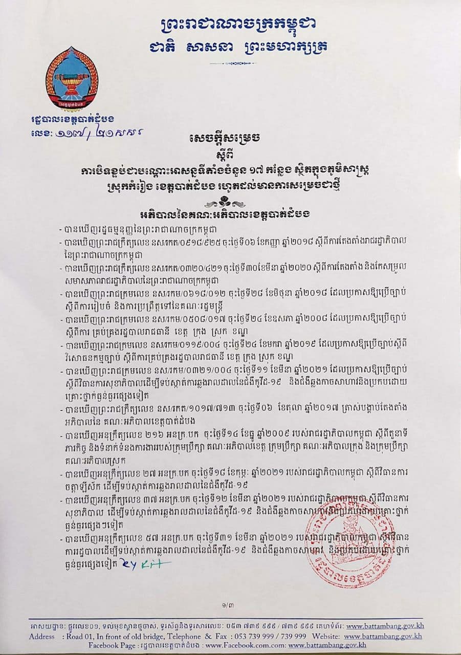 ការបិទខ្ទប់នេះគឺធ្វើឡើងយោងសេចក្តីសម្រេច របស់ រដ្ឋបាលខេត្តបាត់ដំបង លេខ១១៧/២១សសរ. ចុះថ្ងៃទី០២ ខែមិថុនាឆ្នាំ២០២១ ស្តីពីការបិទខ្ទប់នូវខ្នងផ្ទះ និងទីតាំងចំនួន១៧កន្លែង ខាងលើនេះ រហូតដល់មានការជូនដំណឹងជាថ្មី។ ដោយបានភ្ជាប់មកជាមួយនូវខ្លឹមសាររួមនៃសេចក្តីសម្រេចទាំងស្រុង ដូចខាងក្រោមនេះ៖