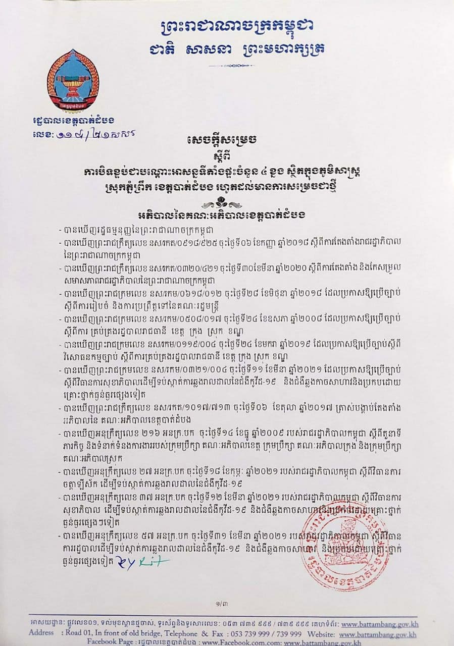 ការបិទខ្ទប់នូវទីតាំងខាងលើនេះដោយយោងសេចក្តីសម្រេច លេខ ១១៨/២១សសរ. ចុះថ្ងៃទី០២ខែមិថុនាឆ្នាំ២០២១នេះ ស្តីពីការសម្រេចបិទខ្ទប់នូវទីតាំងខ្នងផ្ទះចំនួន០៤ខ្នង ស្ថិតនៅក្នុងភូមិភ្នំព្រឹក ឃុំភ្នំព្រឹក និងភូមិភ្នំតូច ឃុំពេជ្រចិន្តា ស្រុកភ្នំព្រឹក ខេត្តបាត់ដំបង រហូតដល់មានការជូនដំណឹ