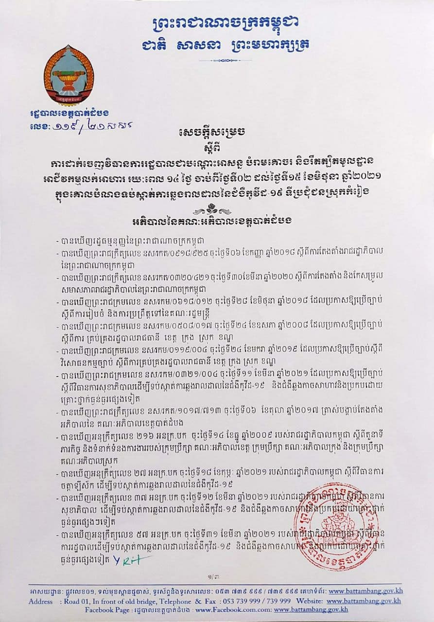 រដ្ឋបាលខេត្តបាត់ដំបង បានដាក់ចេញនូវវិធានការរដ្ឋបាលបណ្តោះអាសន្ន ស្តីពីការហាមប្រាមបំរាមគោចរនិងធ្វើការរឹតត្បិតមូលដ្ឋានលក់អាហារ រយៈពេល១៤ថ្ងៃចាប់ពីថ្ងៃទី០២ដល់ថ្ងៃទី១៥ខែមិថុនាឆ្នាំ២០២១ក្នុង ទីប្រជុំជនស្រុកកំរៀង