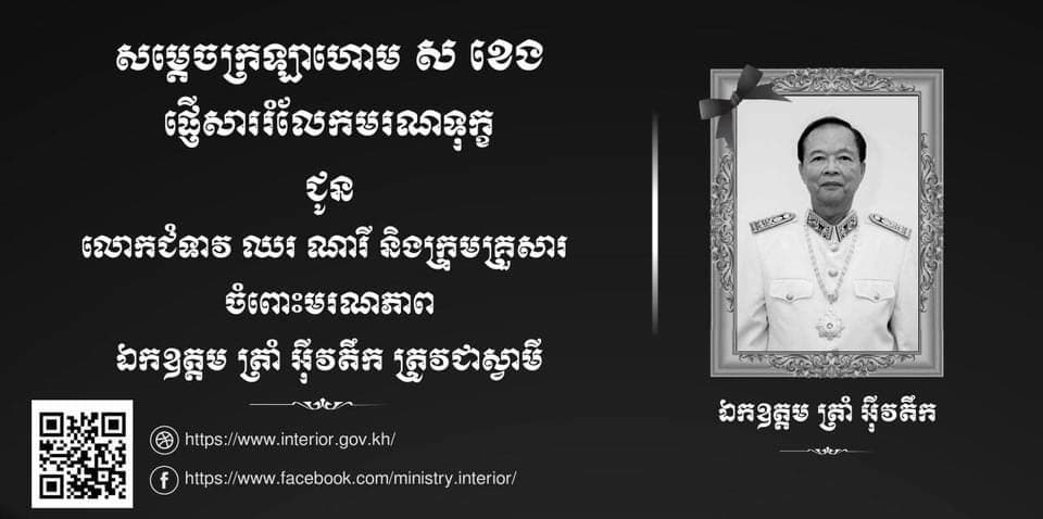 សម្ដេចក្រឡាហោម ស ខេង និងលោកជំទាវ ព្រមទាំងថ្នាក់ដឹកនាំ និងមន្ត្រីរាជការ នៃក្រសួងមហាផ្ទៃទាំងអស់ សូមចូលរួមរំលែកទុក្ខព្រួយដ៏ក្រៀមក្រំនេះ និងសូមឧទ្ទិសបួងសួងដល់ដួងវិញ្ញាណក្ខន្ធ ឯកឧត្តម ត្រាំ អ៉ីវតឹក បានទៅកាន់ឋានបរមសុខ ក្នុងសុគតិភពកុំបីឃ្លៀងឃ្លាតឡើយ៕ដោយ -រ៉ាវុធ